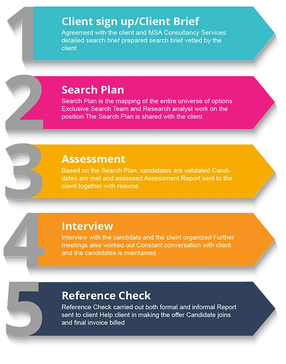 MSA Consultancy Services provides senior level executive search services on a retainer basis for companies. We are one of the few Executive Search firms that conducts Assessments (Psychometric and Personality Assessments) of shortlisted candidates (approved and interpreted by a certified lead Assessor) which helps our clients take the right hiring decision.
